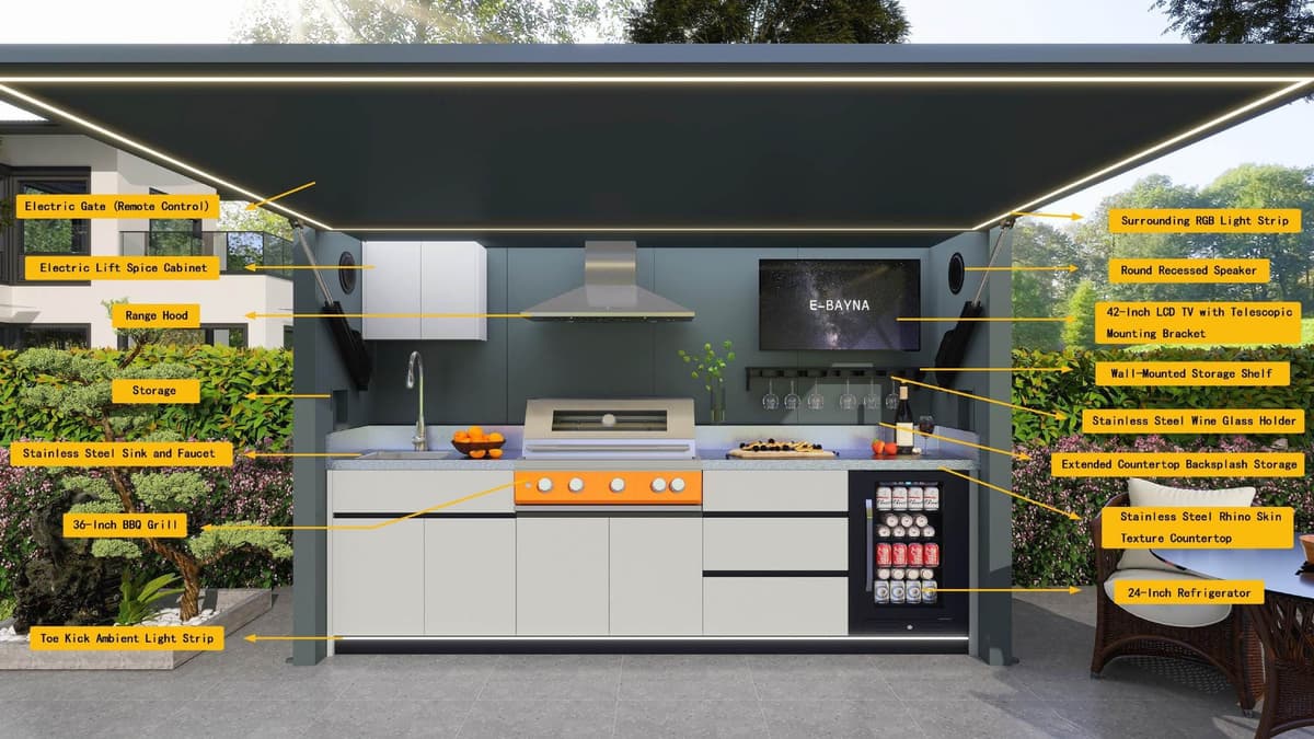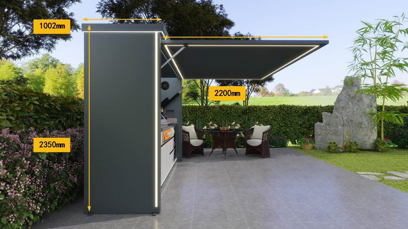 Se abre hacia arriba para proporcionar sombra mientras cocinas y ofrece el máximo nivel de protección contra el sol, la lluvia y el polvo cuando está cerrada.